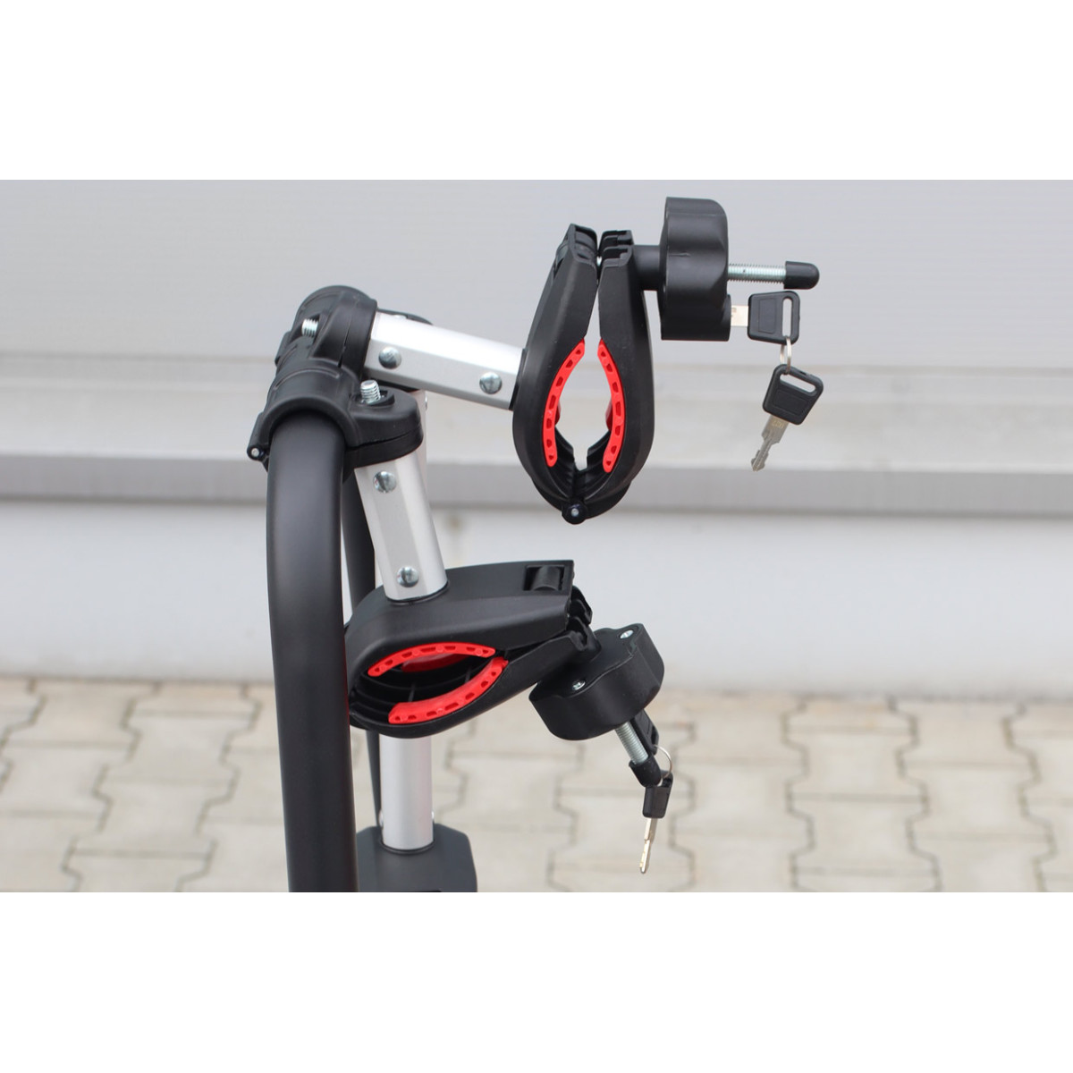 Ein sehr praktisches Fahrradbefestigungssystem – einfach die Halterungen lösen, auf die Fahrräder setzen, mit dem Griff und dem Schlüssel verriegeln, und schon kann es losgehen.