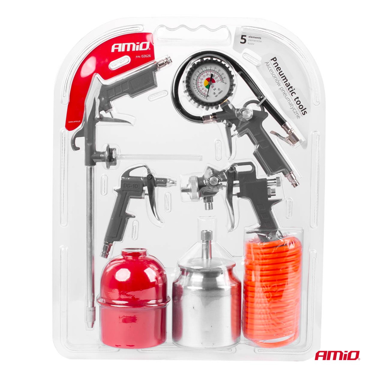 Das pneumatische Lackierset besteht aus fünf Elementen: einer Farbpistole mit Auffangbehälter, einer Bitumen-/Ölspritzpistole, einer Ausblaspistole, einer Reifenpumpe mit Manometer und einem 5 m langen Spiralschlauch. Das Set bietet vielfältige Einsatzmöglichkeiten in der Werkstatt – vom Lackieren bis zur Oberflächenreinigung.