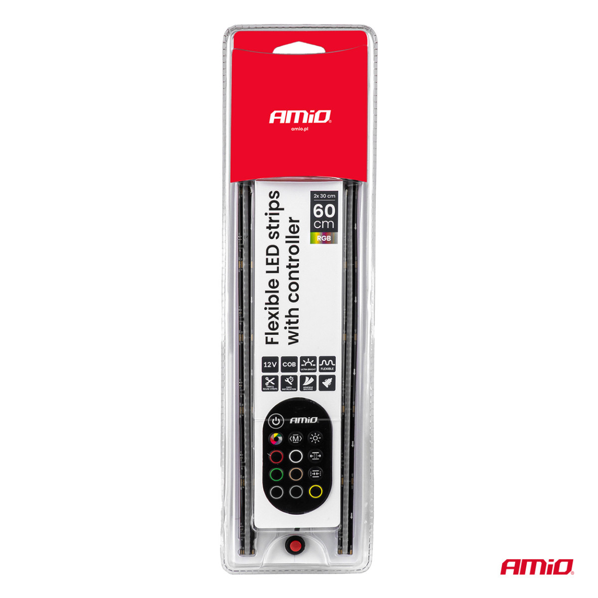 Flexible RGB-LED-Streifen, 12 V. Das Set enthält zwei 30 cm lange Streifen und einen Controller mit Fernbedienung zur Steuerung von Farben und Beleuchtungsmodi. Dank des flexiblen Designs passen sich die Streifen optimal an die Form der Montagefläche an. Das Produkt verfügt über eine Testfunktion, die die Vorführung im Handel erleichtert.