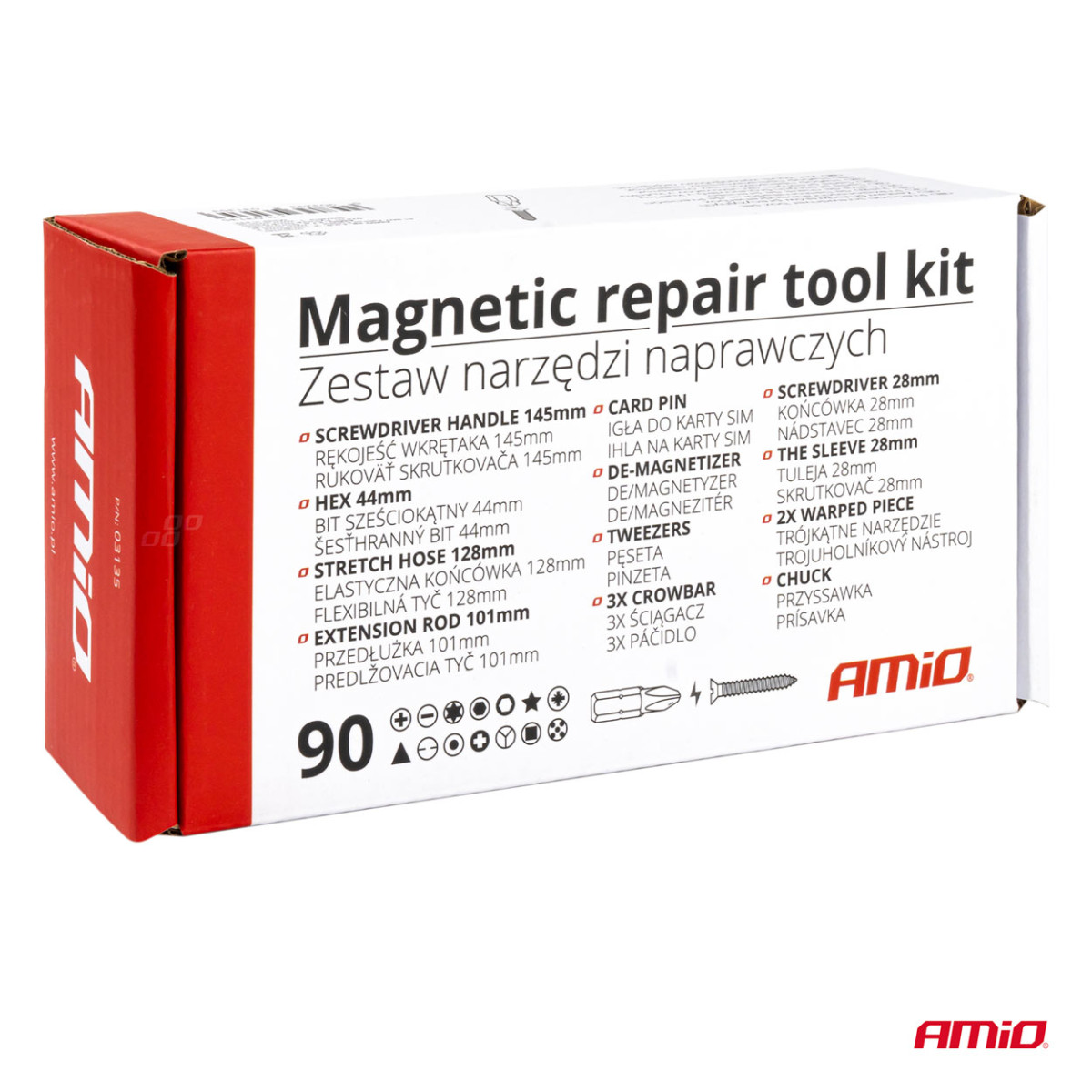 Das Set besteht aus 115 Teilen und eignet sich daher ideal für professionelle Reparaturen oder Heimwerkerprojekte. Es enthält das Hauptwerkzeug – einen universellen Schraubendreherhalter – sowie 98 Bits in verschiedenen Formen und Größen. Zusätzlich sind weitere Werkzeuge enthalten: Gehäuseöffner, ein Magnetisierungs-/Entmagnetisierungswerkzeug, eine Pinzette und weiteres Zubehör.