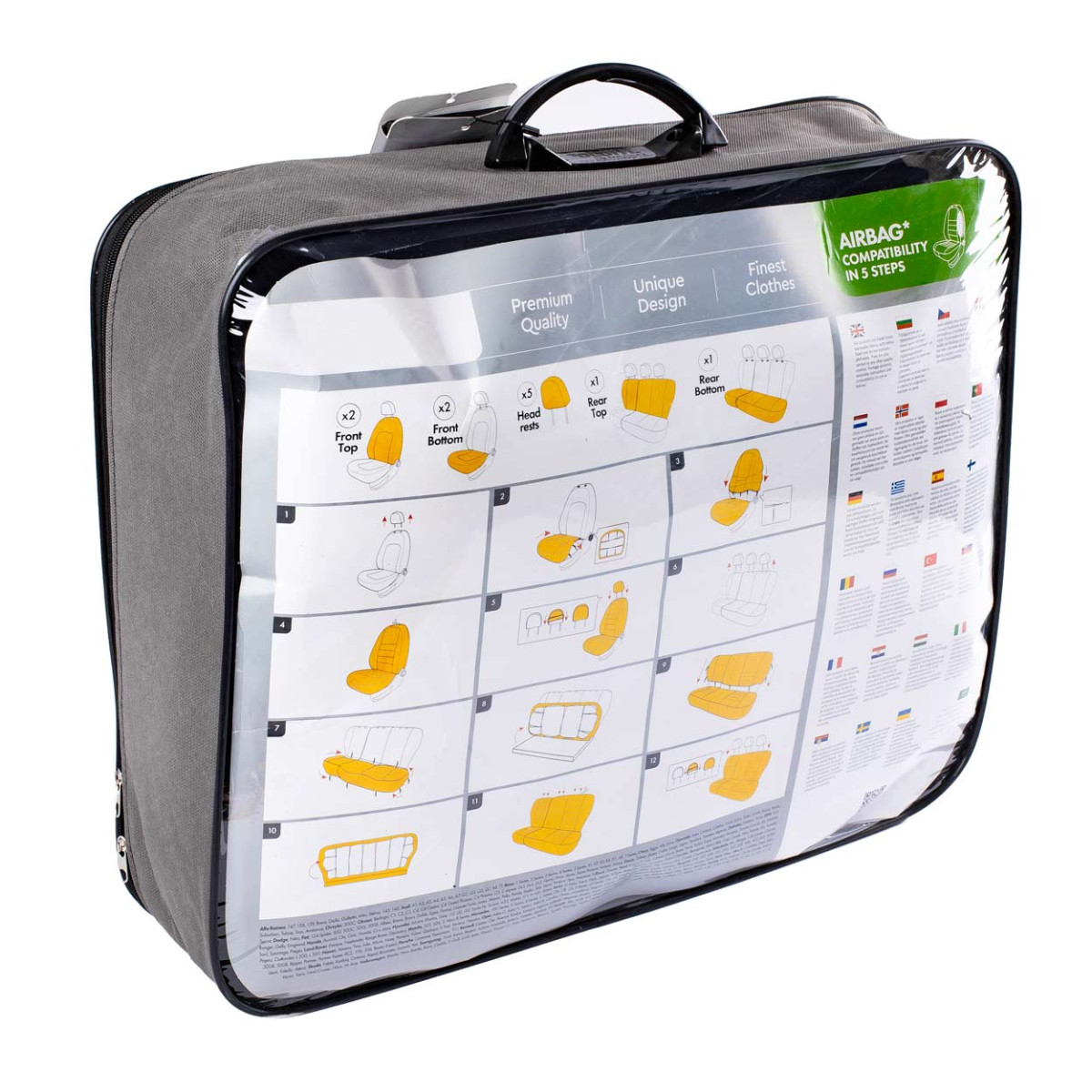 Alle Bezüge bestehen aus laminiertem Polyurethanschaum, wodurch ein Verrutschen auf den Sitzen verhindert wird. Die Bezüge umschließen die Sitze vollständig und schützen sie so optimal vor Schmutz. Sie sind strapazierfähig und leicht zu reinigen. Moderne Designs werten den Fahrzeuginnenraum auf und verbessern die Optik.